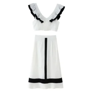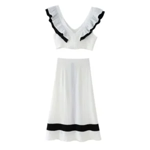 Elegant Skirt Sets For Women V Neck Flying Sleeve Contrast Top High Waist Skirt Female 2 Pieces Set Holiday 2024 Tank Skirt Suit